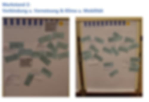 Für den Marktplatz der Ideen wurden die bisher eingegangen Ideen nach Oberthemen geclustert und den acht für die Zukunftsentwicklung von Wald definierten Handlungsfeldern zugeordnet (siehe Präsentation). Jeweils zwei thematisch eng miteinander verknüpfte Handlungsfelder wurden an einem Marktstand diskutiert.
